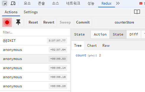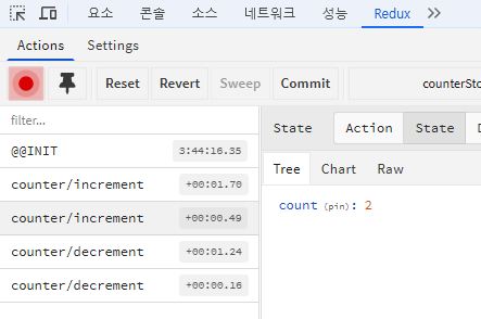 - 세번 째 옵션에 액션 이름을 지정하면 아래처럼 devtools에서 액션이 구분된다.