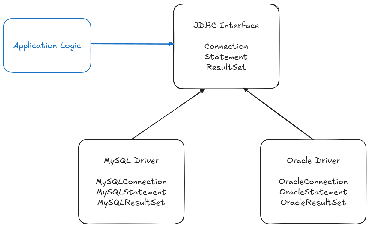 실제 구현체는 각각의 벤더에서 벤더의 DB에 맞도록 구현해서 라이브러리로 제공한다.