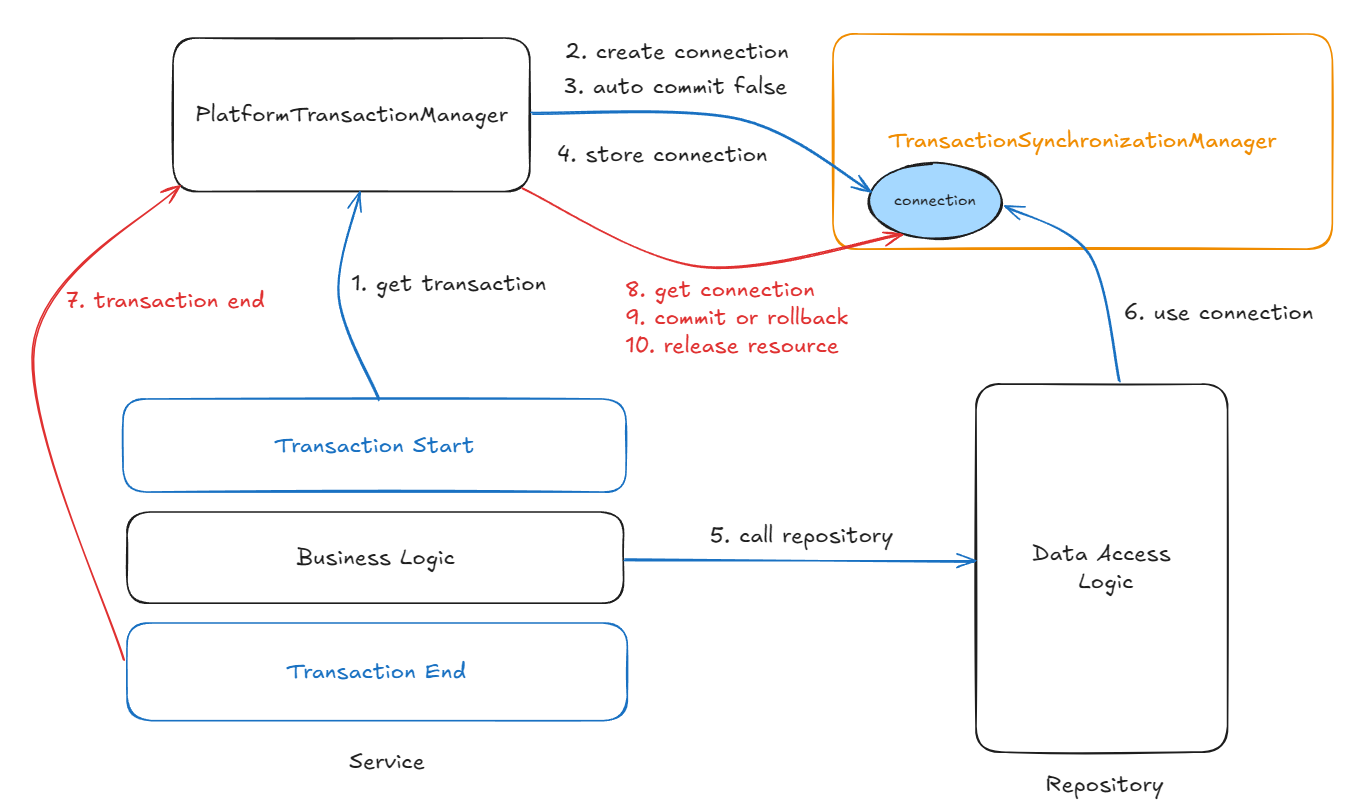 7. 비즈니스 로직이 끝나고 commit 또는 rollback 후 트랜잭션을 종료한다.