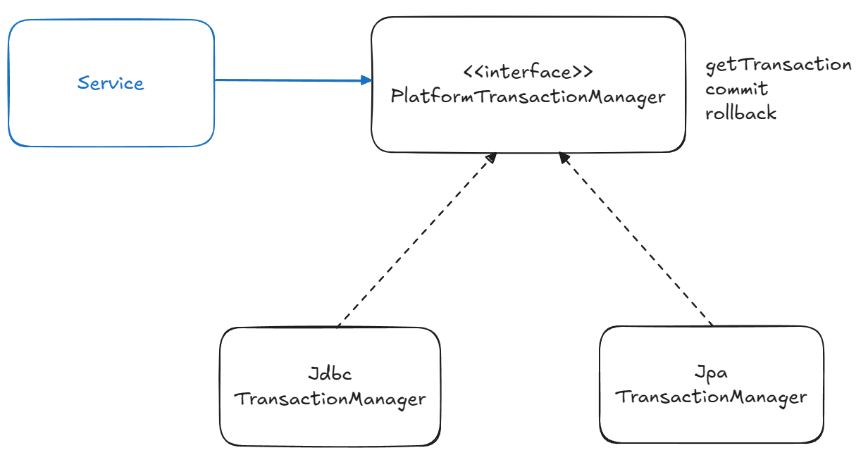 ● 서비스는 PlatformTransactionManager 인터페이스에 의존한다.