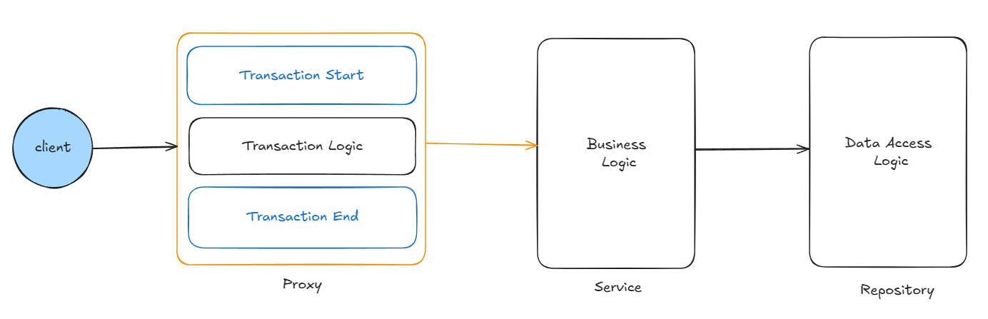 ● 스프링 AOP는 proxy pattern을 사용해서 트랜잭션같은 부가기능을 비즈니스 로직 바깥에서 처리한다.