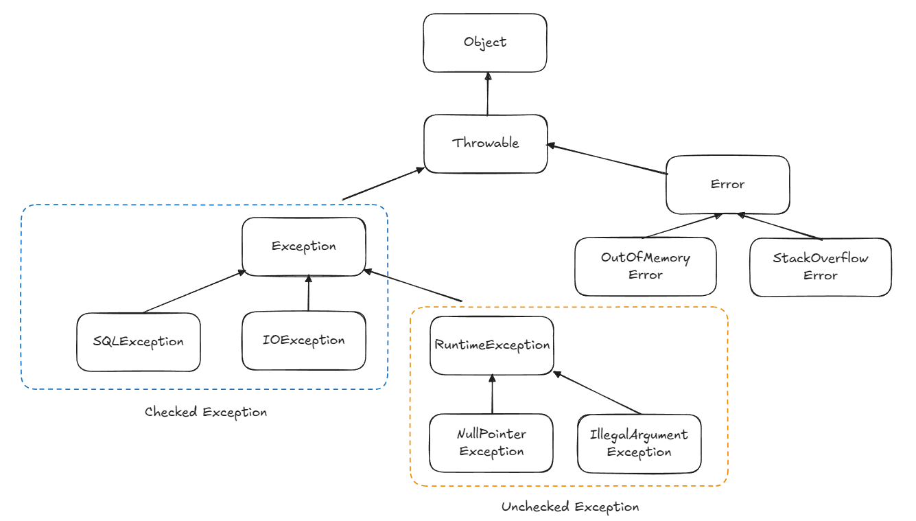 ● throw, throws 키워드로 던질 수 있는 객체는 반드시 Throwable을 상속받아야 한다.