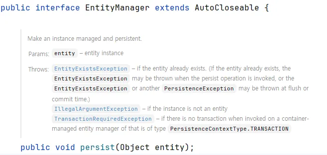 persist 메서드에서 발생할 수 있는 런타임 예외에 대해 설명하는 것을 볼 수 있다.