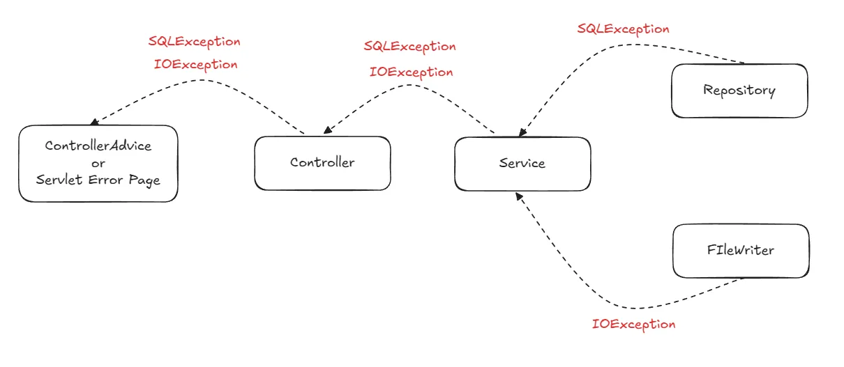 3. 서비스는 Repository, FileWriter를 둘 다 호출하고 두 곳에서 올라오는 체크 예외를 처리해야한다.
