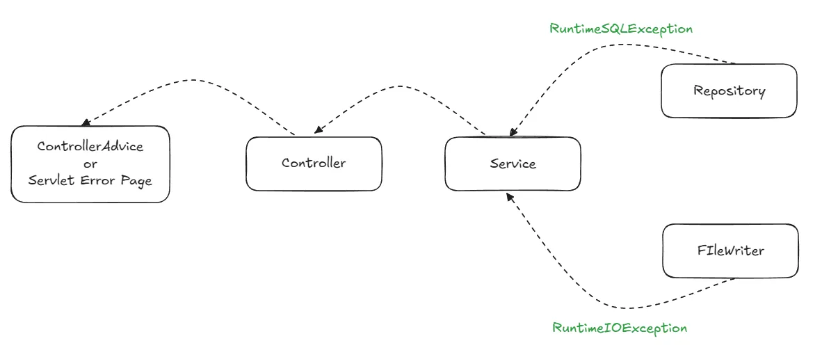 ● 서비스나 컨트롤러 입장에서는 어차피 본인이 처리할 수도 없는 예외를 의존해야 하는 큰 단점이 발생한다.